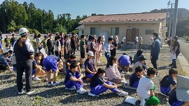 地震,津波警報を想定した休憩時の避難訓練を実施しました。昼休み,訓練地震発生の放送で,校庭,廊下,教室にいた児童はそれぞれの身を守る体勢をとりました。その後,校庭に全員で避難しました。今回はさらに,津波警報を想定して明戸ニュータウンまで避難しました。子どもたちは真剣な表情で訓練に取り組みました。地震や津波はいつ起こるか分かりません。また,誰といるときかも分かりません。常に,児童一人一人が,いつでも,どこでも自分の頭で考え,身を守れるようにと今後も指導していきます。