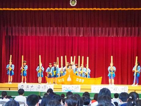 10月26日の学習発表会に向けて各学年で練習に取り組んでいます。今年度は普段の学習の成果を発表するという色を強くした「学習発表会」としておこないます。4年生は総合的な学習の時間の発表として旧中井旧中井小学校の特色ある活動を引き継いで,太鼓と唄い込みを披露します。9日,10日は松圃虎舞,崎浜大漁唄込保存会の方々をお招きして,実際の迫力満点の演奏について学びました。これから,発表に向け練習を重ねていきます。