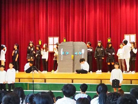 26日学習発表会一般公開を実施しました。観客の多さに緊張してしまった児童もいましたが,1年生から6年生まで、全校児童が保護者,地域の皆様からの温かな拍手と声援を受け,一人一人輝くことができた学習発表会であったと思います。今年度は学芸会を「学習発表会」に変更し,教科の学習の発表であることを濃く出した発表としました。1・5・6年生の劇はすべて国語の教科書教材のものです。2年生は体育,3年生は音楽,4年生は総合的な学習の時間の学習の成果を発表しました。今回の学習発表会の成果を今後の学習や学校生活に生かしていけるよう取り組んで参ります。また,今年度の結果を基に,来年度の実施のあり方も検討していきたいと考えています。