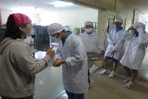◆各学級では給食当番を輪番制(りんばんせい)で行っています。4時間目が終わると給食当番は配膳室に食器や牛乳を取りに来ます。配膳室の前では必ず消毒をします。