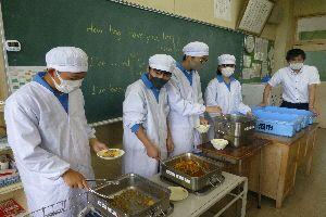 ◆教室では配膳が行われています。当番の生徒は皆さんに配膳しているので,当番の人の分は他の友達が配膳してくれます。