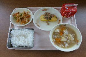◆今日の給食のメニューは,厚焼き卵のそぼろあんかけ,キャベツのおかか和え,豚汁,ごはん,牛乳の計750kcalでした。