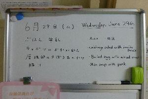 ◆1階の配膳室の前には,「今日の給食のメニュー」が書かれています。そして,ALTのジョナサン先生が勤務している日には,日本語のメニューのとなりに英語バージョンのメニューを書いてくれています。「豚汁」→「Miso Soup with pork」だそうです。なるほど!