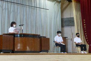 ◆それでも今日は,明日からの夏休みに向けて区切りの日です。給食を食べる前に,体育館で全校集会を行いました。各学年代表のことば,これまでを振り返り,今後へ向けての頼もしい意志を感じました。