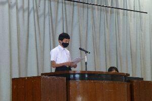 ◆生徒集会の始まりは学校市長のことばです。その中で今年度の気仙沼中学校学校市テーマ「輝耀(きよう)」についての説明と確認がありました。「輝耀」という言葉には,四方に光を発する,きらきらとした美しい光という意味があるそうです。市民一人一人が光り輝き,学校の中心となり活気のある美しい学校市にしていきたいという願いが込められているそうです。