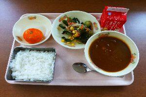 ◆夏休み前,最後の給食のメニューは,海そうサラダ,チキンカレー,冷凍みかん,ごはん,牛乳の計765kcalでした。