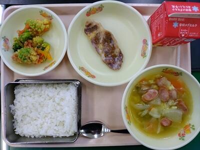 ごはん 牛乳 やさいコロッケ ほうれんそうのサラダ ミネストローネスープ