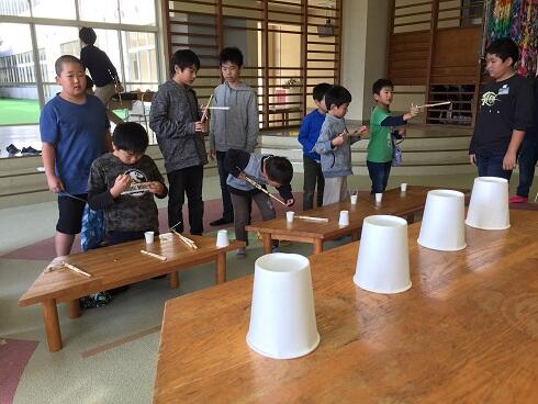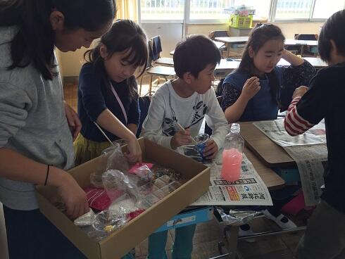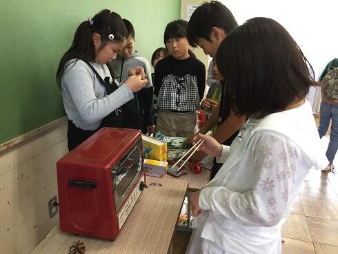5・6年生の子どもたちが計画・準備してきた店で,1年生から4年生までの子どもたちが楽しみました。お化け屋敷で怖くて泣いてしまう子,スライムやプラ板,松ぼっくりツリーづくりに夢中になる子,割り箸鉄砲や釣りゲームに歓声をあげる子,体育館でのタイムチャレンジに真剣に取り組む子・・・子どもたちの楽しそうな表情があふれていました。