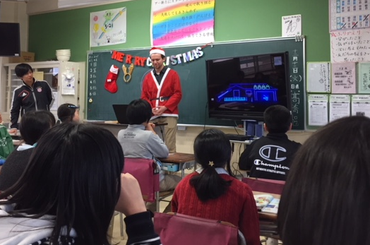 クリスマスの意味やアメリカでクリスマスの頃に住宅をイルミネーションで飾り,音楽を流しながらデコレーションする風景,映画「HOME ALONE」の一場面,クリスマスプレゼントに狂喜乱舞する子どもたちの様子などビデオと写真で詳しい説明をしてくれ,とても楽しい学習ができました。