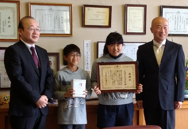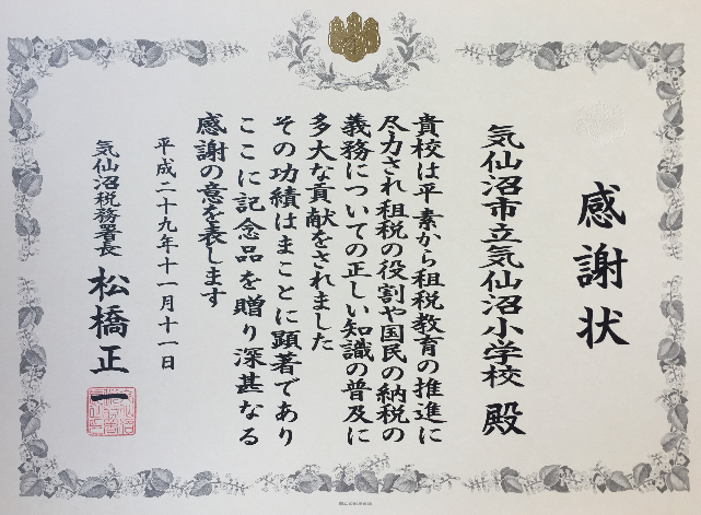 気仙沼税務署の松橋正一署長さんから6年生の代表の子に感謝状と記念品をいただきました。12月6日には今年度の租税教室が行われます。租税の役割や国民としての納税の義務など6年生の子どもたちも社会科の学習で学んでいきます。