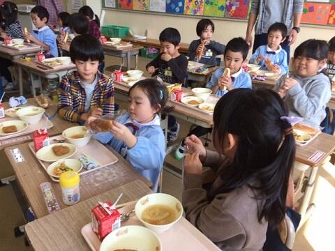 本校では幼保小の交流を進めていますが,今日はカトリック幼稚園の子どもたちと1年生の子どもたちが一緒に給食をとりました。1年生の子どもたちは,牛乳のストローを袋から出すのを手伝ったり,パンを袋から出してあげたりと,隣に座った幼稚園の子どもたちに優しく接していました。幼稚園の子どもたちも来年の小学校入学に向けて,よい経験になったようです。