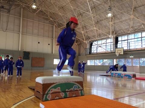 1年生は体育で跳び箱を使った運動遊びです。跳び乗りや跳び下り,手を着いて跳び越したりまたいだりと,とても楽しそうです。