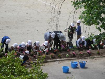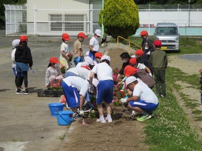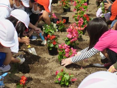 学年ごとの活動として,6月13日から17日の間に校舎前の花壇に360株のベコニアの苗を植えました。児童は,割り当てられた花壇に苗を植える穴を開け,苗の彩りを見ながら一株一株丁寧に心を込めて植えていました。今後は,学年ごとに水かけをしたり,除草をしたりして花のお世話をします。また,栽培委員会の5・6年生が花壇経営のサポートをします。