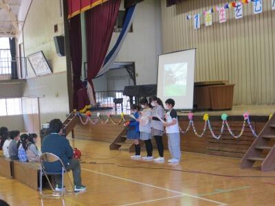 4月21日(金)の2校時に,1年生を迎える会を行い,全校児童で1年生の入学をお祝いしました。2年生は入退場の花のアーチ,3年生は招待状づくり,4年生はメッセージ入りのメダルのプレゼント,5年生は会場装飾,6年生は会の運営と学校紹介で会を盛り上げました。1年生は笑顔でクイズに参加したり,元気いっぱいのダンスを披露したりすることができました。