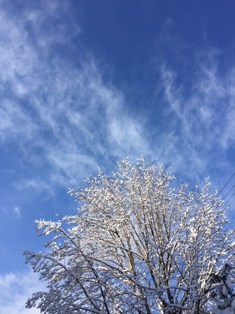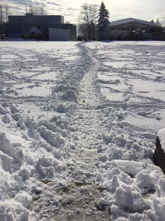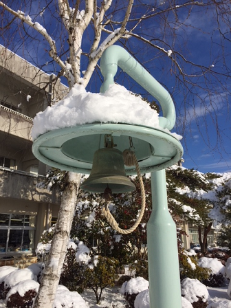 木々も白く雪化粧しました。校庭には,白い通学路がつくられ,「友情の鐘」も白い綿帽子です。