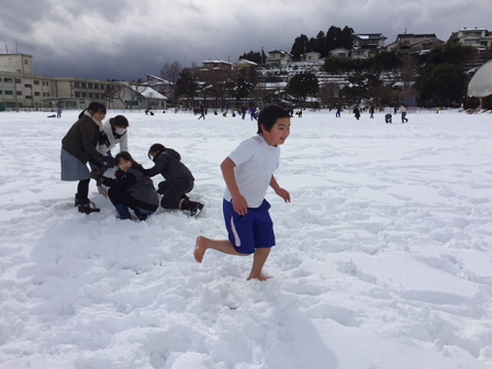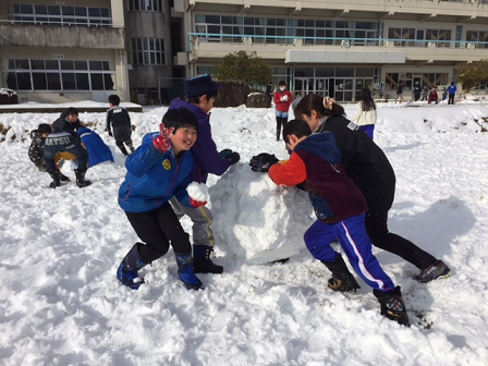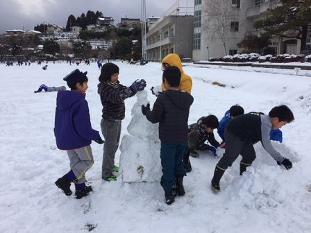 休み時間には,子どもたちが雪遊びです。雪だるまをつくる子,かまくらをつくろうと雪を集める子,裸足でかけっこする子……,子どもたちは元気です。