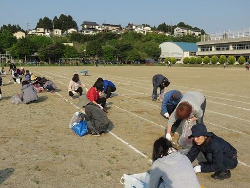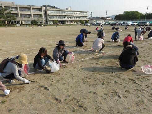 午前6時半から大勢の保護者の皆様においでいただき,校庭に生えた草の除草作業をしていただきました。子どもたちだけではなかなかできないところを作業していただき,とてもきれいになりました。来週開催する運動会は,美しくなった校庭で行うことができそうです。保護者の皆様,ありがとうございました。