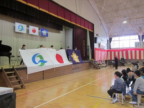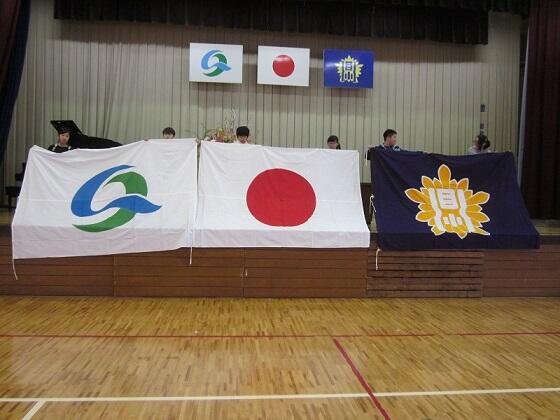 本日,修了式の後,子どもたちに新調した国旗等を披露しました。運動会等で掲揚するとともに,校名旗については6年生の子どもたちが毎日掲揚塔に掲揚します。
