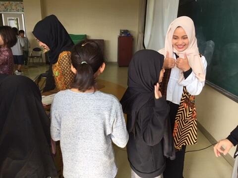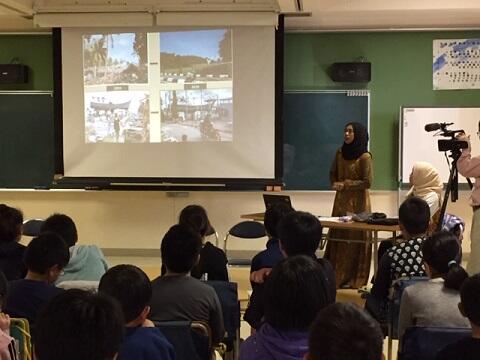 5年生の子どもたちが総合的な学習の時間でインドネシア・アチェの小学校との交流学習を行いますが,そのスタートしてのワークショップです。インドネシアとアチェについて場所,あいさつ,文化,街の様子,食べ物などを分かりやすくプレゼンテーションをしていただきました。その後,イスラム教徒の女性が髪を覆うためのスカーフであるヒジャブの体験やインドネシアの辛い調味料であるサンバルの試食を行いました。ヒジャブでご機嫌の女の子や辛いサンバルを「うまいっ!」とおかわりする子など,インドネシアへの関心が大きくふくらんだようでした。