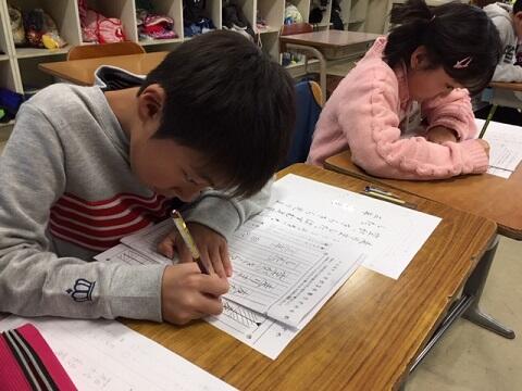 3年生は,書きぞめの硬筆練習です。手本をよく見て,一画一画を丁寧に書きます。真剣です。