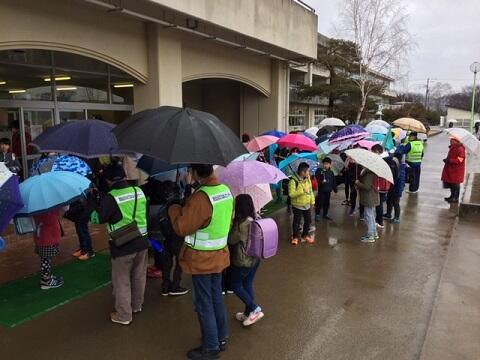今日は,あいにくの雨模様となりましたが,高学年のリーダーを中心に子どもたちがまとまって下校することができました。そして,いつも登下校の見守りをしていただいている防犯協会の皆様,南地区民児協の皆様,通学安全ボランティアの皆様の御協力をいただき,実施しました。ありがとうございました。