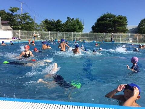 雲ひとつない晴天の下,子どもたちがプールを思いっきり楽しんでいます。初日の今日は,107名の子どもたちが来ました。友達と競走する子,鬼ごっこをする子……とても楽しそうです。遊びの中から水に親しむこと,泳力の向上,友達への思いやりなど多くのことを学んでほしいと思います。
