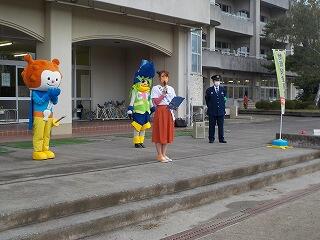 10月13日,みやぎ防犯広報大使の萌江さんが気仙沼小学校にやって来ました,1~3年生の児童は,萌江さんと一緒に防犯の合い言葉「いか・の・お・す・し」の意味や安全な横断歩道の渡り方について確認した後,コースに分かれて集団下校しました。