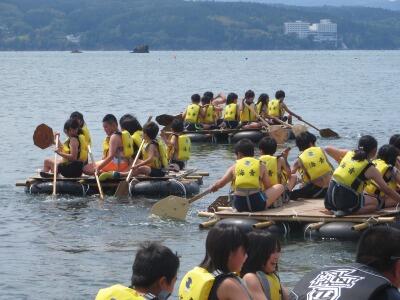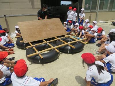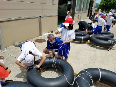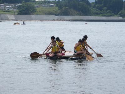 6月21日は,遠足の第三弾として,4年生が宮城県志津川自然の家を訪れ,海に親しむ活動を楽しみました。午前中は,宮城県志津川自然の家の先生の指導の下に,筏を作り,午後はその筏をグループごとに海に浮かべて思い思いに筏をこいで走らせました。児童は,海水の冷たさを忘れて海上での活動を満喫しました。活動の最後には,バナナボートに乗せていただき,スピード感を体感して楽しみました。児童は,仲間と協力することの大切さを学ぶとともに,海と共に生きる気仙沼人としてとても貴重な体験をすることができました。