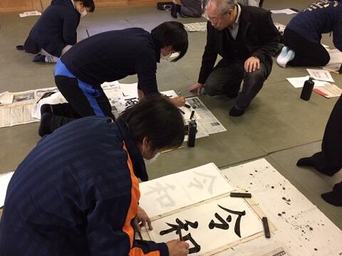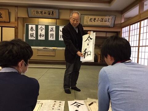 佐藤均先生にお出でいただき,書きぞめ指導のポイントについて教えていただきました。今年度の書きぞめ(毛筆)の文字は「山川」「正月」「令和」「春風」です。「穂先の向き」「力の入れ方」「点画のつながり」「文字の組み立て方」「字形」などに気を付けて書きますが,なかなか難しいものです。佐藤均先生から「自分では書けなくても,言葉で指導できる」ことを教えていただき,子どもたちへの指導にいかすことができそうです。