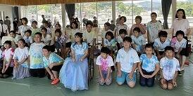 7月25日(日)に,宮崎県在住のピアニスト・野田あすかさんが,気仙沼市を訪れ,「まち・ひと・しごと交流プラザPier7」軽運動室でミニコンサートを行いました。6年生の子どもたちも,あすかさんのピアノに合わせて,「しあわせ運べるように(気仙沼ver.)」と「ココロノイロ」の合唱を披露しました。自分たちで染めたTシャツを着て,きれいな歌声を響かせました。