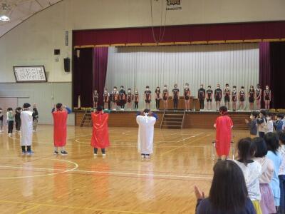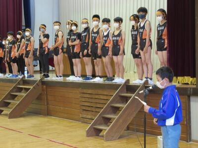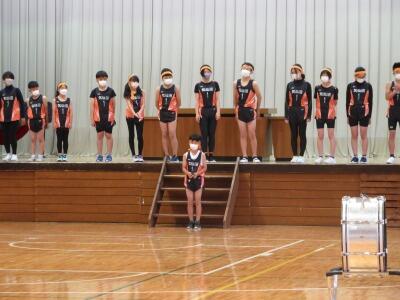 本日は,業前活動として,6月1日に実施予定の市立小学校体育祭に参加する代表児童を激励する壮行式を行いました。児童会の放送委員が進行を務め,5・6年生の代表選手が体育館に勢揃いしました。式の中では,選手代表が意気込みを発表し,運動会で活躍した応援団が中心となって選手に力強いエールを送りました。体育祭は,新型コロナウイルス感染症予防の観点から,5・6年生の選手のみの参加となりますが,代表児童の活躍がとても楽しみです。なお,体育祭の参観は,代表児童一人に付き,御家族1名となっております。