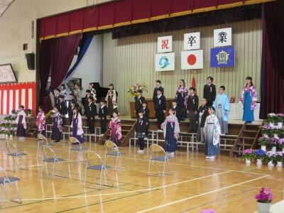 3月17日,薄日が差す早春の空の下,体育館を式場に卒業式を実施し,31名の6年生が親しんだ学び舎を巣立ちました。卒業式は,父母教師会会長様と学校評議員の皆様の御臨席を賜り,保護者様や在校生代表の5年生,教職員が見守る中,厳かな雰囲気に包まれて6年生一人一人が校長先生から卒業証書を手渡されました。卒業式の後段では,6年生全員が6年間を振り返り,中学校生活への希望を膨らませている思いを門出の言葉で表現しました。卒業式の中,6年生一人一人の瞳は輝き,その表情には卒業と中学生になる喜びが満ちあふれていました。