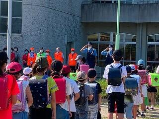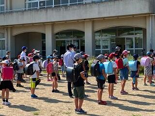 自然災害時や不審者の出没等により,緊急に児童の安全確保が生じた場合を想定した集団下校訓練を行いました。8月21日(金)に行われた第1回は集団下校の途中で地震が起きたことを想定した訓練を行い,身を守る場所や,津波が起こった際に避難する場所を確認しました。