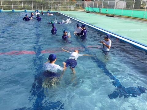 最後は,今年1年のプールでの水泳学習に感謝して,全員で手をつないで「ドボン」です。 子どもたちそれぞれが,自分の目標に向かって努力をしたプールでの水泳学習でした。