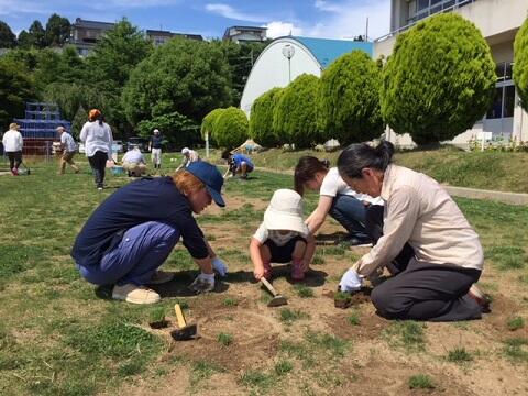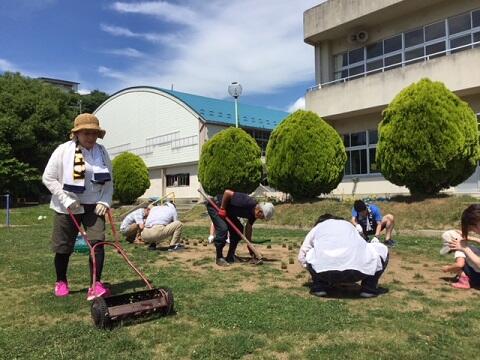今日は,気温が30℃に届きそうな真夏のような暑さになりましたが,東京城南ロータリークラブの三浦様をはじめ総勢5名の皆様と気仙沼南ロータリークラブの小野寺会長,吉越様,八島造園の皆様が,芝生の薄くなったところに新しい芝生の苗を植えてくださいました。