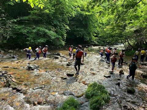沢遊び・・・午後は,沢遊びです。今日はとても天気がいいので,絶好の沢遊び日和です。とても気持ちよさそうに遊んでいました。ほとんど水泳状態の子もいました。