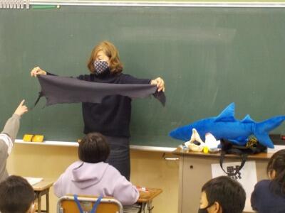 3年生は,総合的な学習の時間に「海を生かした地域の産業~スペシャルフィッシュのひみつを追え~」のテーマのもと,気仙沼港に水揚げされるサメについて調べ学習を行っています。この日(12月16日)は,南町のムカエル1F株式会社シャークスの熊谷さんをゲストティーチャーにお招きして,サメからできる製品について学びました。子どもたちは,これまでの活動では分からなかったことについて進んで質問していました。調べてまとめた成果は2月に発表する予定です。