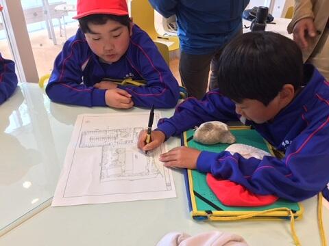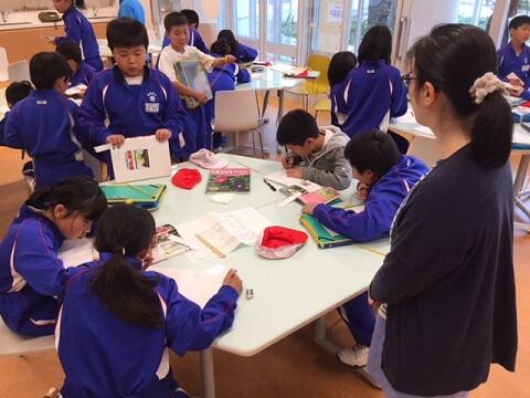 気仙沼図書館の庭などの設計を行った「背景計画研究所」の井上さんからワークショップのねらいや内容についてうかがった後,気仙沼図書館の山口司書さんからスイセンについて調べるための図鑑などの使い方を教えていただきました。子どもたちはグループごとにスイセンの種類や特徴などについて調べ,そして,スイセンを植えたところに目印にする割り箸に自分の名前を書き,準備万端です。