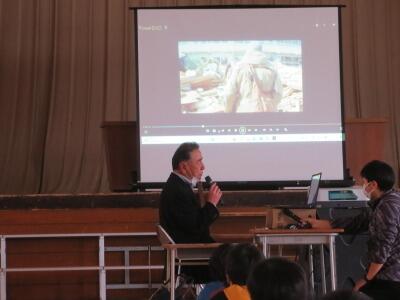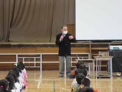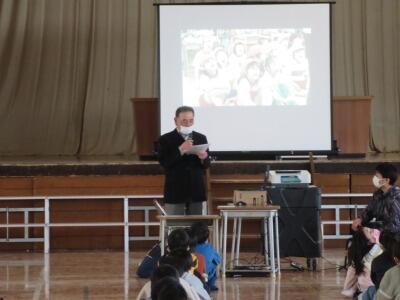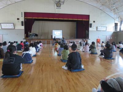 3月10日,みやぎ鎮魂の日を前に全校児童が体育館に集合し,全校集会を実施しました。集会の前段では,東日本大震災で犠牲になられた方々に思いを寄せて黙祷を捧げました。後段では,校舎内に津波が押し寄せた南気仙沼小学校で当時校長を務められていた中井充夫先生をお迎えして講話をしていただきました。中井先生は,当時外国で放映された南気仙沼小学校のドキュメントの映像を紹介しながら,当時の様子を話してくださいました。最後のお話として,児童に「災害は必ずやってきます。自分の命は,自分で守ることが大切です。」と,説かれました。本校の児童は,中井先生のお話を真剣に聴いて,人命の大切さと災害に備える心構えを深く考えていました。