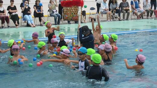 1・2年生の低学年では,プールの中を元気いっぱい走ったり,ビート板を使って泳いだりする個人種目と水中玉入れの団体種目に子どもたちが楽しそうに取り組みました。
