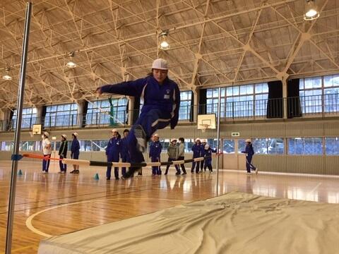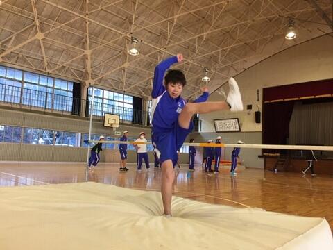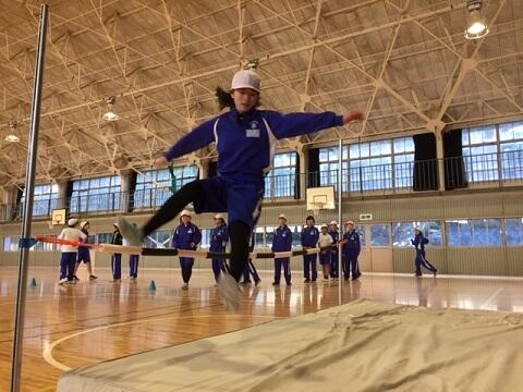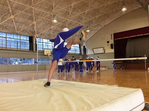 リズミカルな助走から踏み切って,はさみ跳びで跳びます。助走,踏み切り,空中姿勢,着地などに気を付けながら,陸上運動の楽しさを味わっています。
