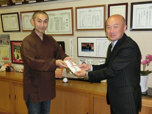 東日本大震災後,毎年御支援をいただいている大阪府箕面市の帝釋寺の住職 小西徹定 様が来校され,御支援金(20万円)をいただきました。