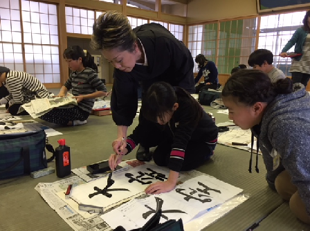 子どもたち一人一人に丁寧に指導していただいて,教えていただいた子は「なるほど」と感嘆の声を上げていました。書の大家の先生に教えていただき,子どもたちは真剣そのものです。