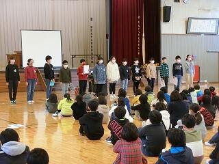 集会では,まず校長先生から,写真とともに震災当時の気仙沼の様子が伝えられました。その後,4年生以上の代表児童が総合的な学習の時間で学んだことを発表しました。4年生は「防災マップ」,5年生は「海との共生について考えよう」,6年生は「私たちの町 未来の気仙沼」というテーマで発表しました。1年間の学習を通して学んだことを発表する児童とともに,発表を真剣に聞いている児童の姿からも1年間一生懸命学習してきたことが感じられました。