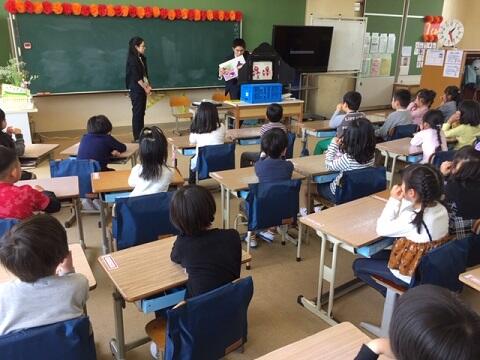 気仙沼図書館職員の方が,1年生の子どもたちに読み聞かせを行ったり,気仙沼図書館の利用の仕方などについて紙芝居を使って分かりやすく話したりしてくださいました。1年生の子どもたちのほとんどが,これまでお家の方に気仙沼図書館に連れて行ってもらい,利用した経験があったようで,「知っている」「(図書利用カードを)見たことある」と親近感を持って話を聞いていました。