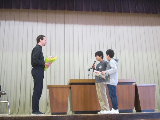 体育館でのお別れ会では,子どもたちとの思い出と別れが寂しいこと,市内でまた会ったときに声を掛けてほしいと,ディラン先生からスピーチがありました。これまで子どもたちに楽しい学習をしてくれたこと,そして子どもたちに温かく接してくれたディラン先生なので,子どもたちから大人気でした。子どもたちからのメッセージにも,その思いがあふれていました。