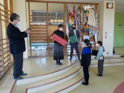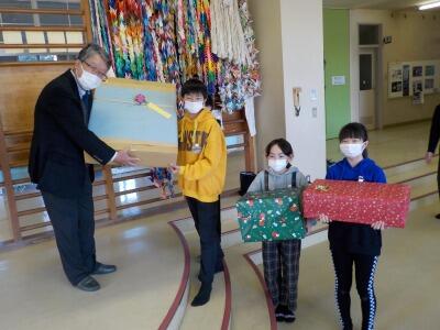 12月23日(木)作新学院小学部の八島先生はじめ,3名の先生が来校し,来年のカレンダーを届けていただきました。いただいたカレンダーは作新学院の児童による手作りで,毎年,気仙沼小学校のあんばホールに飾られます。月ごとに季節感が感じられる素敵なカレンダーは,一年間,私たちの目を楽しませてくれます。このカレンダーは,気仙沼小学校のホームページにも毎月掲載しています。ぜひ御覧ください。