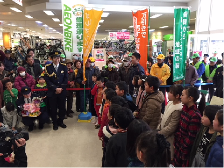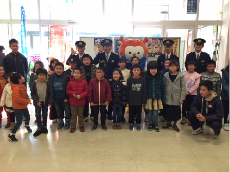 一日署長を務めたのは,マギー審司さんです。気仙沼ジュニア・ジャズ・オーケストラ・スウィング・ドルフィンズの演奏から始まり,110番通報についてのお話,マギー審司さんのマジック,110番通報についてのクイズなどがあり,とても楽しいひとときでした。その後,サプライズとして,気仙沼小学校の子どもたちから感謝の気持ちを込めて,全校のみんなでつくった寄せ書きと花束を贈り,「ひまわりの約束」の歌を合唱しました。これまでマギー審司さんから「あんばちゃん」をいただいたくなど震災後いろいろな支援をいただいているので,子どもたちからの心を込めた感謝の気持ちです。