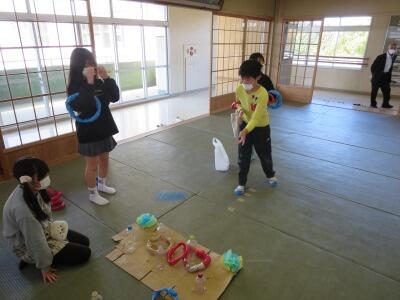 10月28日に,児童会が企画・運営する「あんば祭り」を実施しました。開会行事では,児童会の歌を歌い祭りを盛り上げ,5・6年生の代表が開くお店を紹介し,校長先生から励ましのお話をいただきました。祭りの中心は,5・6年生が8グループを編成し,下学年を楽しませようと工夫を凝らしたお店を準備して開店させ,1年生から4年生が自由にお店を回って楽しむ活動です。お店を回ると,体育館ではボールや跳び箱、マットなどを使って運動できるアスレチックのお店に多くの児童が集まって楽しむ様子が見られました。また,校舎内では,輪投げや射的で遊べるお店,スライムやプラバンを作って楽しむお店や迷路を進みながらクイズに挑戦するお店が大盛況でした。閉会行事では,校内放送を活用して各学年の代表が感想を発表しました。教頭先生からは,「たくさんの笑顔が見られて楽しい活動になったことは,5・6年生の頑張りです。」とお褒めの言葉をいただきました。