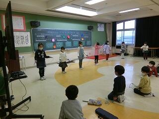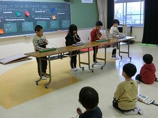 1年生は,生活科の学習で入学してからの1年間の中でできるようになったことを振り返り,「できるようになったこと発表会」を開いて学習の成果を発表しました。国語,算数,昔の遊び,工作,楽器,跳び箱,縄跳びなどの様々なグループごとに1年間でできるようになったことを披露しました。それぞれのグループごとに,練習してきた成果を精一杯発揮することができました。